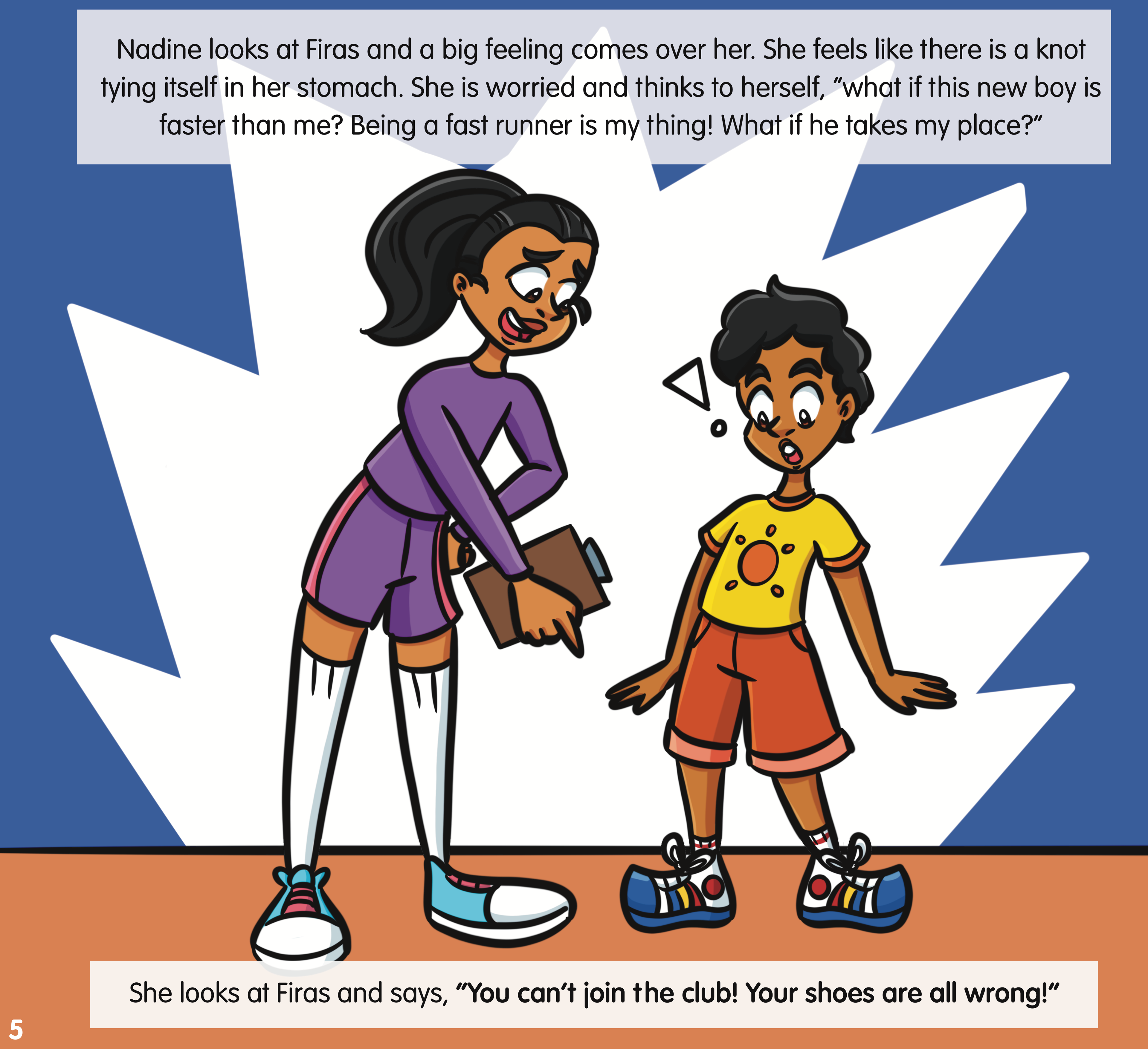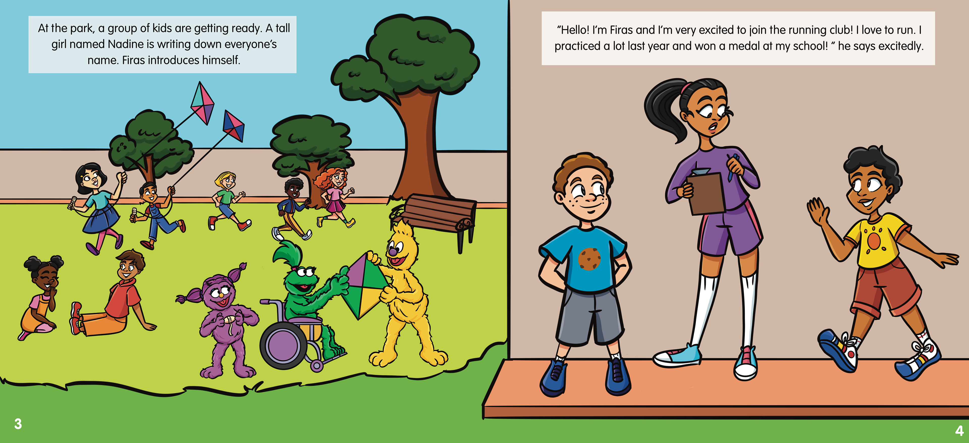 "Bullying can manifest itself in different ways and in different settings. In this story, Firas, a new student at school is excluded from joining a running club. When the Ahlan Simsim friends notice, they invite Firas to play with them. Ameera advises Firas to speak to an adult when experiencing unkind treatment. Firas learns that people's hurtful actions sometimes result from big feelings and an inability to deal with them appropriately."